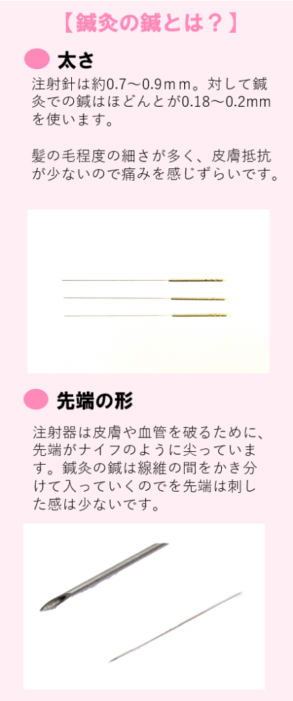 「鍼を刺す」と聞くと、痛いのではないかと心配になる方も多いのではないでしょうか。しかし、鍼灸施術で用いる鍼は大変細く、先端が丸いため、刺してもあまり痛みはありません。