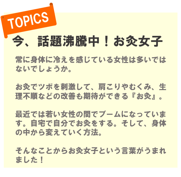 お灸は身体の表面に温熱的刺激を与える施術です。お灸には、もぐさと呼ばれるヨモギの葉の裏にある綿毛から作られたものを使用します。もぐさを固めて火をつけ、熱でツボを刺激します。