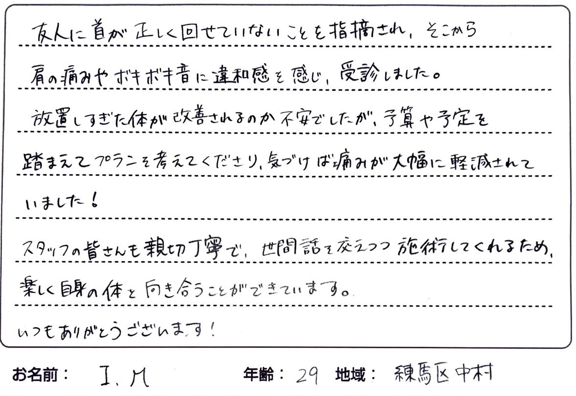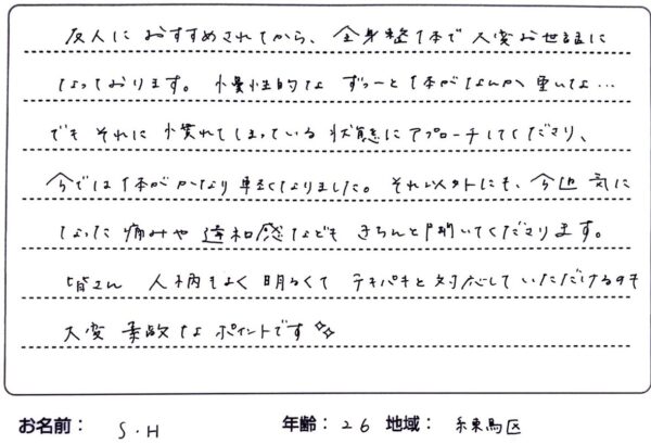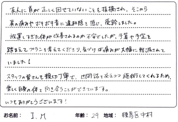 まずは、「どうして肩こりが起きているのか」その原因を探ります。背骨や骨盤の歪みかもしれませんし、他にも原因があるかもしれません。
