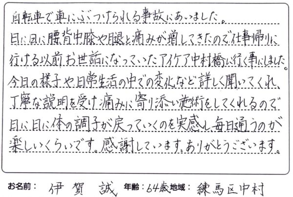 自転車で車にぶつけられる事故にあいました。 日に日に腰背中膝やと痛みが増してきたので仕事帰りに、行ける以前お世話になっていたアイケア中村橋に行く事にしました。 今日の様子や日常生活の中での変化など詳しく聞にてくれ、丁寧な説明を受け痛みに寄り添い旅術をしてくれるので日に日に体の調子が戻っていくのを実感し、毎日通うのが楽しいくらいです。感謝しています。ありがとうございます。