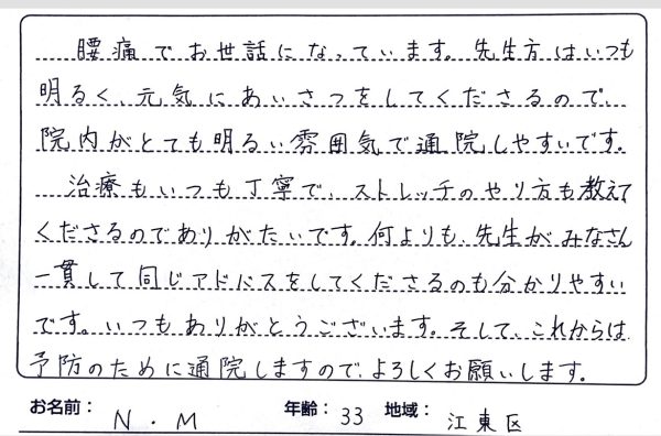 腰痛でお世話になっています。先生方はいつも明るく、元気にあいさつをしてくださるので院内がとても明るい雰囲気で通院しやすいです。 治療もいつも丁寧でストレッチのやり方も教えてくださるのでありがたいです。何よりも、先生がみなさん一貫して同じアドバスをしてくださるのも分かりやすいです。 いつもありがとうございます。そして、これからは予防のために通院しますので、よろしくお願いします。