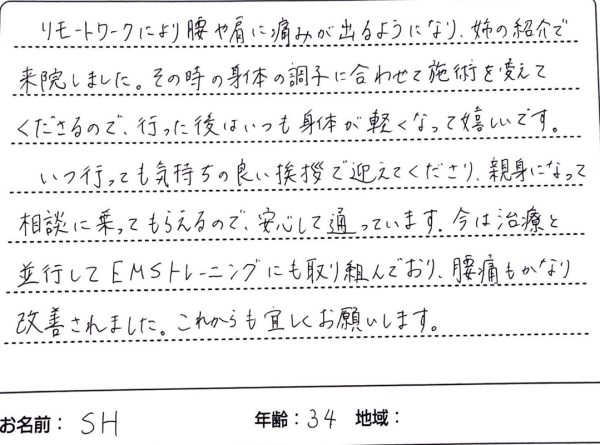 リモートワークにより腰や肩に痛みが出るようになり、姉の紹介で来院しました。その時の身体の調子に合わせて施術を変えてくださるので、行った後はいつも身体が軽くなってうれしいです。いつ行っても気持ちの良い挨拶で迎えてくださり、親身になって相談に乗ってもらえるので、安心して通っています。今は治療と並行してEMSトレーニングにも取り組んでおり、腰痛もかなり改善されました。これからも宜しくお願いします。