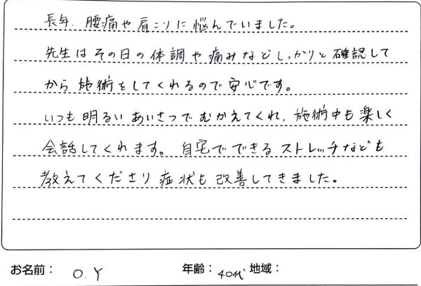 長年、腰痛や肩こりに悩んでいました。 先生はその日の体調や痛みなどしっかりと確認してから施術をしてくれるので安心です。 いつも明るいあいさつでむかえてくれ、施術中も楽しく会話してくれます。自宅でできるストレッチなどを教えてくださり症状も改善してききした。