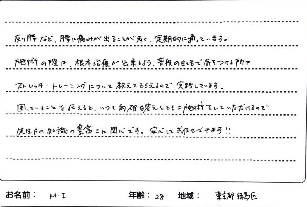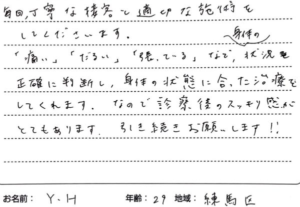 全身メンテナンス 練馬区 29歳 男性 Y・H