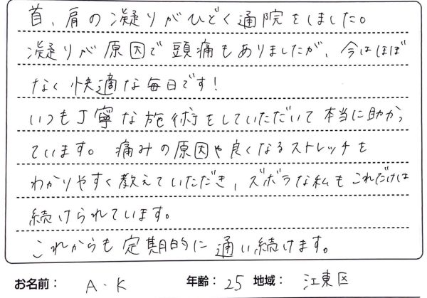 首、肩の凝りがひどく通院をしました。 凝りが原因で頭痛もありましたが、今はほぼなく快適な毎日です! いつも丁寧な施術をしていただいて本当に助かっています。痛みの原因や良くなるストレッチをわかりやすく教えていただき、ズボラな私もこれだけは続けられています。 これからも定期的に通い続けます。